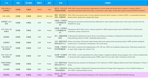 在乳腺癌领域,恒瑞创新产品相关研究共入选1项口头报告、1项简短口头报告、8项壁报和1项电子壁报,共11项研究。吡咯替尼、达尔西利、阿得贝利单抗、瑞康曲妥珠单抗等新老创新药物,均有多篇研究入选,展现出j9国际站在乳腺癌领域多年深耕的丰硕成果。